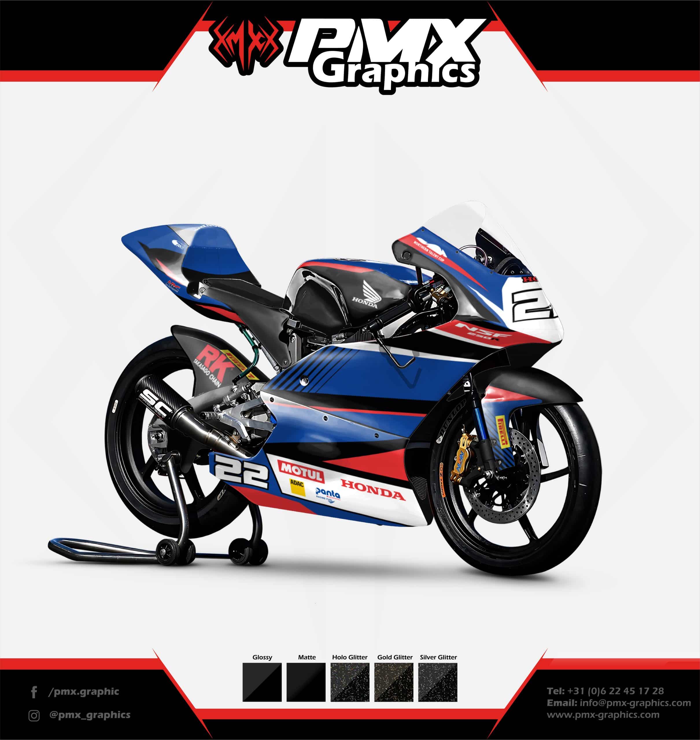 The Honda NSF Graphic Kit – Tri-Color Apex blends iconic Honda tricolor styling with modern race precision. This design reinterprets the classic red, white and blue color scheme into a sharper and more performance-driven layout for the Honda NSF. The result reflects the racing identity shaped by Honda Racing Corporation, but with a contemporary edge.